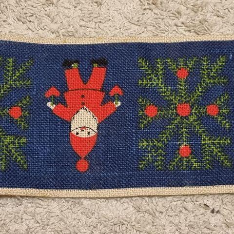 Jouluinen kaitaliina. Tonttukuviot kirjottu. Pohja luonnonvalkoinen puuvillakangas.