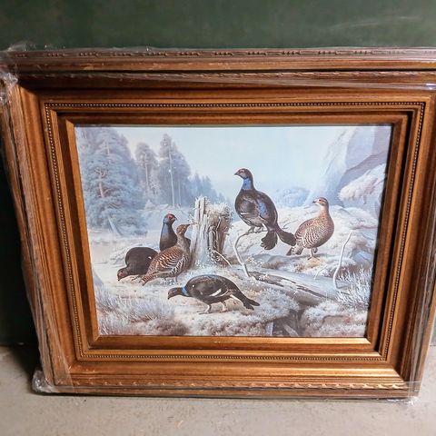 Ferdinand von Wrightin litografiatyö Taistelevat metsot. Työn korkeus on 11 cm ja leveys 17 cm. Kehys 19 X 25 cm.