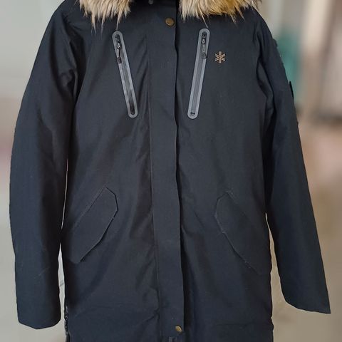 Kiinteä ja säädettävä huppu, jossa nyöri. Hupussa irrotettava, pehmeä tekoturkisreuna (jäljittelee harmaata sudenkarvaa). Korkea kaulus, jonka sisäpinta harjattua polyesteriä. Kaksisuuntainen vetoketju, tuulisuojalista ja tarrasuljenta ja painonapit. Johdonpidike pääntiessä. Helmassa kaksi taskua, yksi rintatasku. Kaikissa vedenpitävä vetoketju. Helmassa olevissa taskuissa on suojaava napillinen kansi. Pystysuora sisätasku, jossa vetoketju ja aukko kuulokkeiden johdolle. Nyöri vyötärön sisäpuolella ja helmassa. Hihansuissa piilotrikooresori ja peukalonaukko. Tikattu kangasvuori. Pituus n. 85 cm koossa 36.