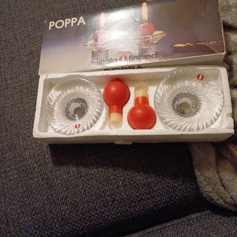 Myydään Iiittalan kirkkaat Poppa kynttilänjalat, 2kpl. Suunnittelija Valto Kokko. Korkeus 3,5cm, halkaisija 7cm.