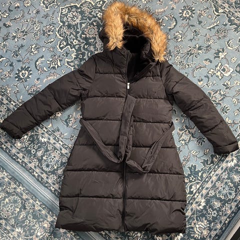 Tummansininen uusi toppatakki. Lämmin ja muhkea takki, joka ei tullutkaan omaan käyttöön. Todellinen väri näkyy kuvassa 2.
