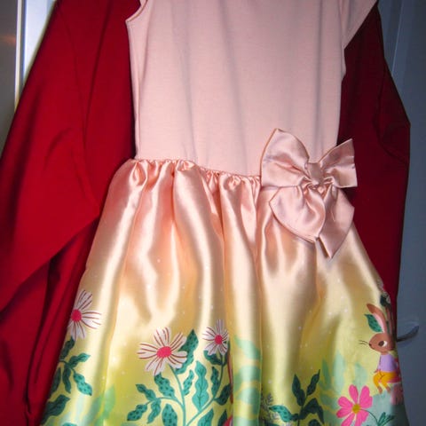 -Tällä puvulla on helmassa liukuvärjäys vaaleanpunaisella.
