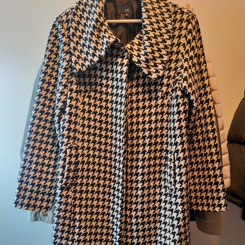 Hupullinen naisten pitkä villakangastakki. Takki on 60% villaa.
