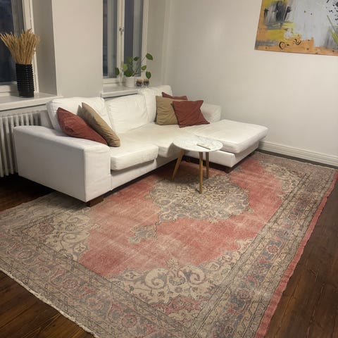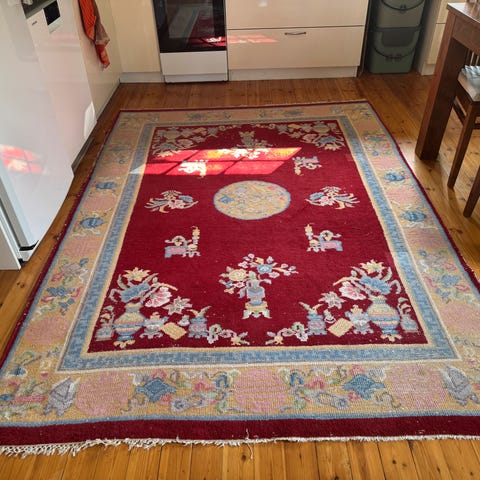 Vintage villamatto iso 159x203 cm, kunto hyvä. Ollut säilytyksessä rullalla, sen vuoksi kuvassa ”ryppyinen”.