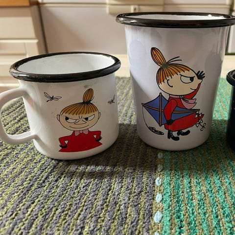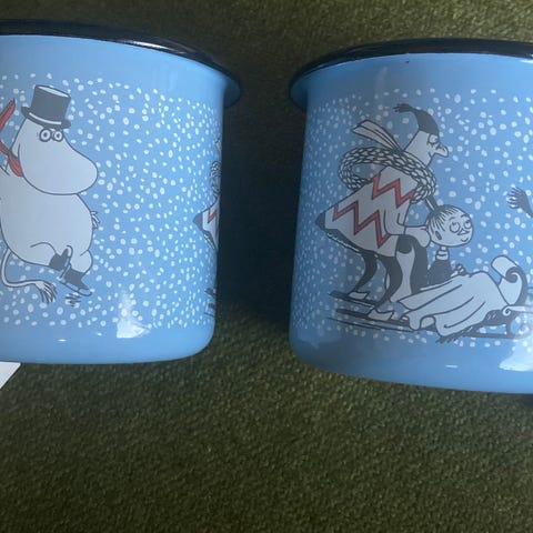 Muurlan emali mukit,muumit ja poro kuviolla. Virheettömät,olleet käytössä yhden kerran retkellä.