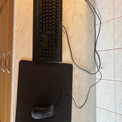 2 hiirtä, näppäimistö ja hiirimatto ja hiiren piuhan pidike.