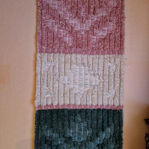 Intian tiikerit tai Afrikan savannit tulevat mieleen tämän ruskealla,beigellä, aprikoosilla ja luonnonvalkoisella kudotun työn väreistä.