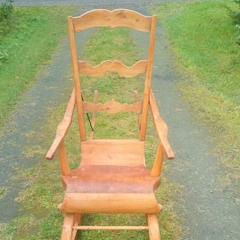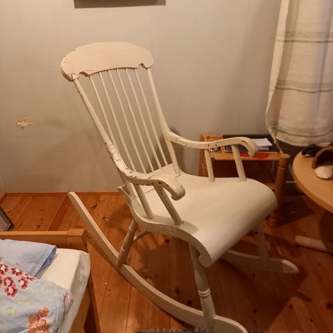 Vanha matalaselkäinen keinutuoli -50- luvulta. Valkoisen maalin alla alkuperäinen tummanruskea. Selkänojan ja käsinojien liitokset joutuu liimaamaan uusiksi. Nouto Oulu, Kaukovainio.