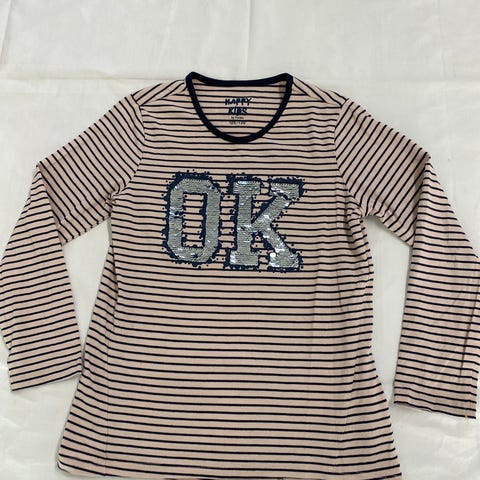 Erittäin siisti sini-valkoraidallinen paita punaisin tehostein. Koko 122-128 cm.