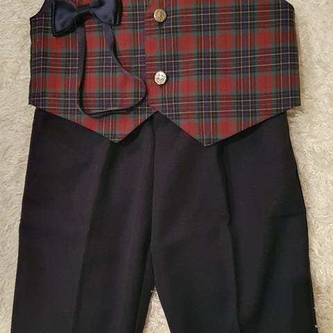 Rennot ja kivat juhlavaatteet. Pitkähihainen helikopterikuosillinen paita ja tumman siniset liivi, rusetti ja housut. Kevyttä pellavamaista kangasta. Siistit ja hyväkuntoiset. Tuoksuton koti, ei eläimiä. Postikulut ostajalle.