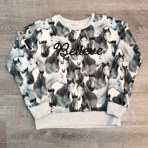 Siisti vaaleanpunainen paita hevosen kuvilla, koko 140 cm.