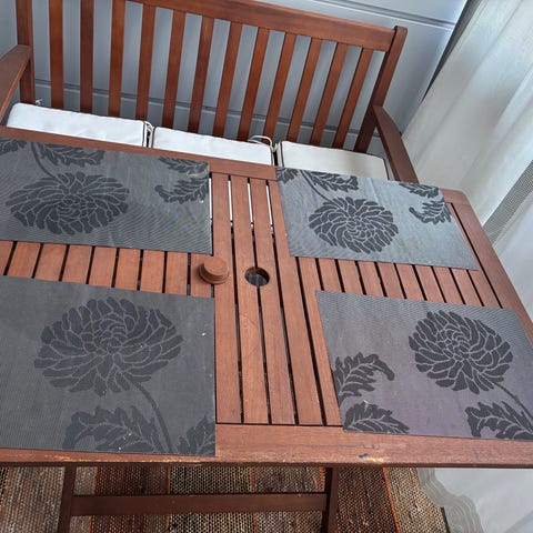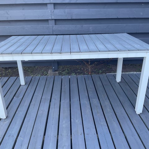 Myydään tarpeettomaksi jääneitä puutarhakalusteita, 2 kuvan mukaista pöytää ja 8 tuolia. Kunto muuten hyvä, mutta kaipaavat öljyämistä. Pöydän saa taitettua pystyyn, joten on helppo varastoida. Myös tuolit taittuvat kasaan. Merkki Asko Classic Garden.