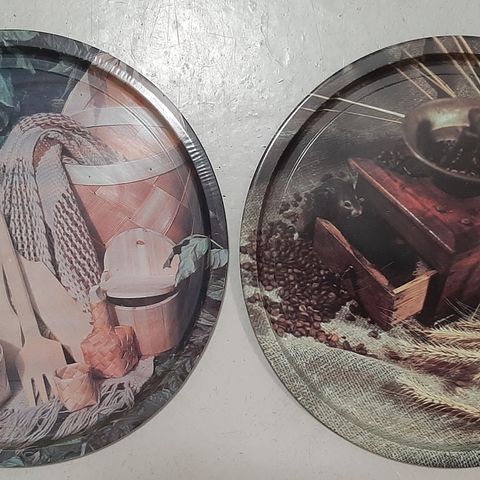 Tarjottimen pinnalla pyöreitä kuvioita ja hieman joissain kohtaa kulumia.