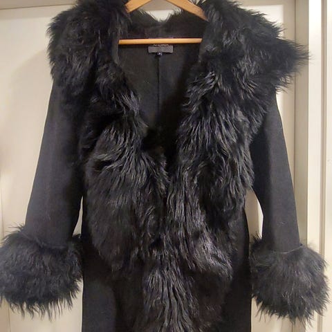 Andiata leticia- villakangastakki. Ostettu talvena 2023, mutta jäänyt itsellä käyttämättömäksi. Olen 163cm pitkä ja takki ylettyy noin puoleen väliin säärtä.