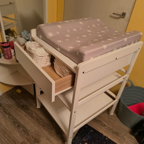 * Myös leveys on hoitopöydällä nyt 67cm, eli siihen sopii juuri hyvin hoitotaso/alusta ja viereen tarvittavat vaipat ja puhdistusaineet.