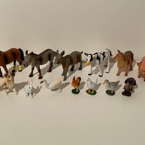 Maatila, karjatila, tila, lelu, keräily, harrastus, hevonen, nauta, possut, sika, kanat, kili pukki, retro, vintage, 80-luku, hahmo, eläinhahmo, maatalo, eläin, paimenkoira, leikki, eläimet, arkku, laatikko, vilja, farmi, keräily