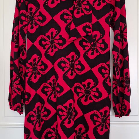 Leveys kainaloiden alta 39cm, vyötäröltä 36cm ja helmasta 51cm. Pituus 93cm. Hihan pituus 46cm.