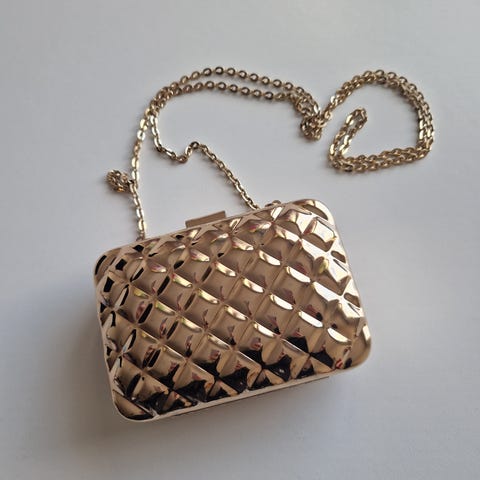 MYYDÄÄN: Ruskea kultainen shamppanja pikkulaukku. Tummalla vitjalla.