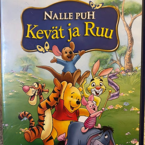 Avaamaton lahjapakkaus jossa kaksi Nalle Puh-elokuvaa sekä pieni pehmo.