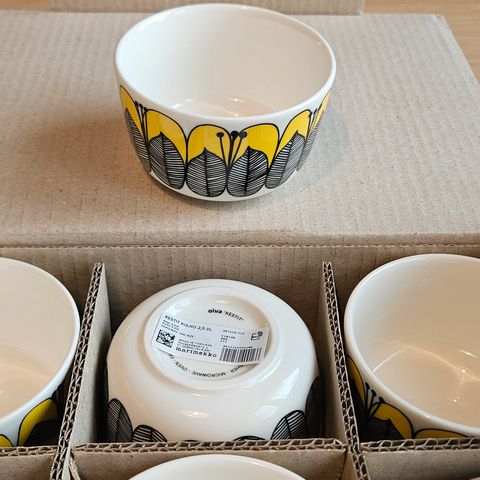 Marimekon keltaiset Kestit-kulhot Oiva-sarjaa, vetoisuus 2,5dl. Kuosin suunnittelu Maija Louekari. Stockmann 150 - juhlavuoden sarjaa. Hinta molemmille yhteensä.