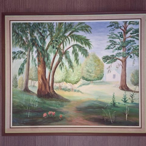 Maisemamaalaus, jossa näkyy peltoa, puita ja rakennuksia taustalla. Maalaus on kehystetty ja esittää luonnonmaisemaa. Värit ovat maanläheiset, kuten vihreän ja ruskean sävyjä. Taulun tekijän nimi epäselvästi kirjoitettu.