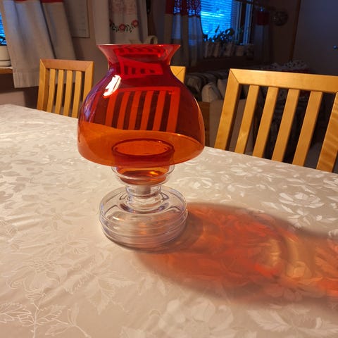 Myynnissä tilanpuutteen vuoksi Riihimäen lasin Apollo kynttilälyhty kauniin vihreä. Pienesti käytönjälkiä mutta ei juurikaan huomaa. Yksi pieni särö ala osan kaulus reunassa josta kuva. Kynttiläpidikettä ei ole mukana. Mielellään nouto.