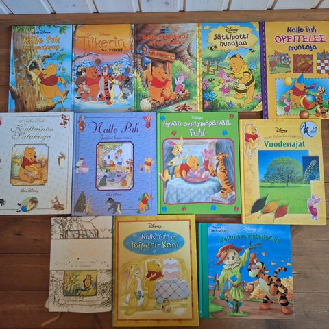 Ethän tingi. Lisätty ensimmäinen kuvasanakirja. Lisätty Nalle Puhin syntymäpäiväjuhlat lautapeli. Iso setti Nalle Puh tavaraa. Käyttämätön kerhoreppu, unilelu valolla, kakkuvuoka, sateenvarjo. Suurin osa kirjoista on kuin uusia, noita paksuja ei edes koskaan luettu, ei vaan kiinnostanut lapsia eikä vanhempia nalle puh. 10 kirjaa ja foliopallo jonka voi täyttää ilmalla tai heliumilla. Joulukirja ylärivissa on luettu pari kertaa, kaikki siihen kuuluvat kirjelappuset on tallessa, samoin tiikerin perhe ja pieni matkakirja on selailtuja. Puuhakirja käyttämätön ja muut isommat kirjat uudenveroisia.