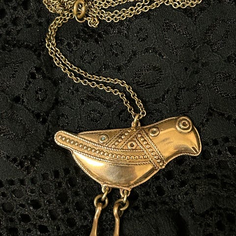 Myydään pronssinen Kalevala koruriipus Huttulan lintu. Ketju n. 61 cm pitkä. Riipuksen leveys n. 3,3 cm.