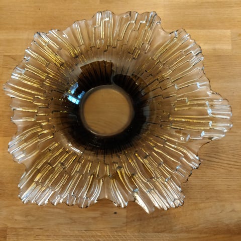 Humppilan lasin ruskea Revontuli-malja. Pohjassa signeeraus "Humppila Finland Tauno Wirkkala". Ehjä.