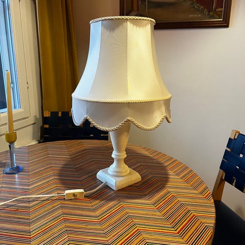 Alabasteri pöytävalaisin 1980-luvulta, tuotu USAsta. Erittäin hyväkuntoinen. Kukkakuvio, toinen puoli kuvioton. K. 20 cm, pallon leveys 15 cm. Vain nouto. Kulkeutuu myös Rauman suuntaan sovittaessa.