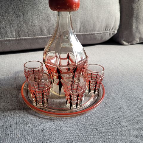 Riihimäen lasi, vanha karahvi ja 6 kpl ryyppylasi / snapsilasi