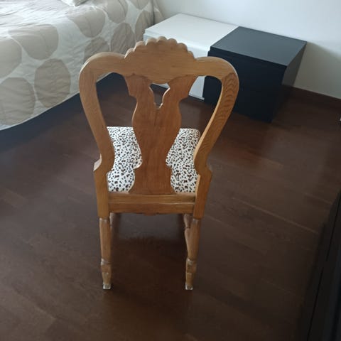 Vanha talonpoikaistuoli, Windsor. Kahdeksan pinnaa selkänojassa. Tuoli on maalattu ruskealla kiiltävällä maalilla, alla on vihreä maali, ruskeaa maalia on jonkin verran lähtenyt pinnasta. Muuten ehjä vanha tuoli. Istuinosa satulanmuotoinen, korkeus 42,5 cm, istuitason leveys 42x40 cm, selkänojan korkeus 83 cm. Vain nouto.