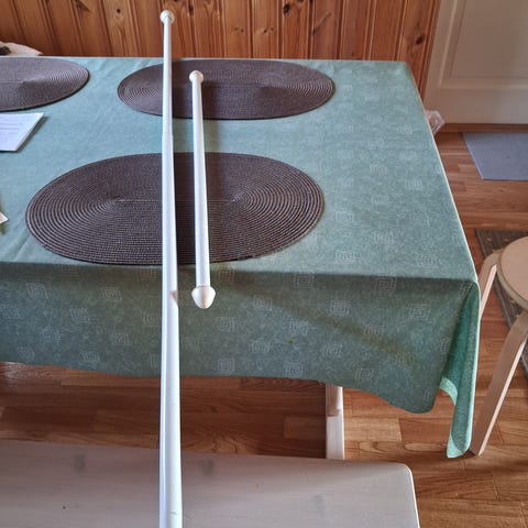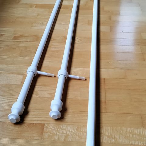 9-10. valkoinen puinen verhotanko ja pyöreät verhonipsut, tangon koko pituus 129cm. 10eur