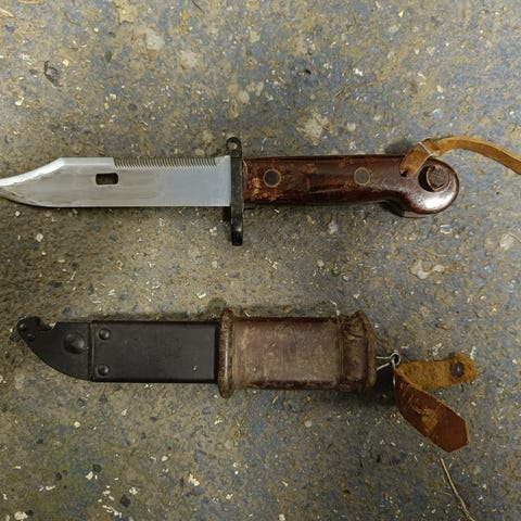 Hyväkuntoinen pistin, terässä näkyvät laikut suojaöljyä, ei ruostetta yms.