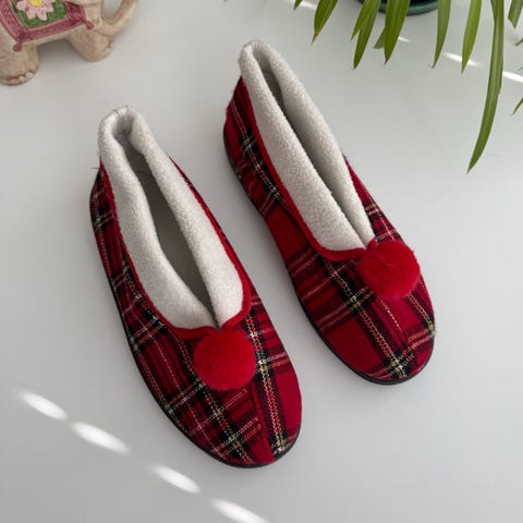 Avaamattomassa paketissa naisten punaiset tohvelit. 100% polyesteri. Valmistettu Italiassa. Jouluisat. Firman joululahja, ei käyttöä.
