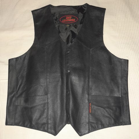 Uusi, musta nahkaliivi, jossa paljon taskuja ja metalliset vetoketjut. Koko XL, joka ehkä hieman reiluhko ja siksi jäänyt käyttämättömäksi.