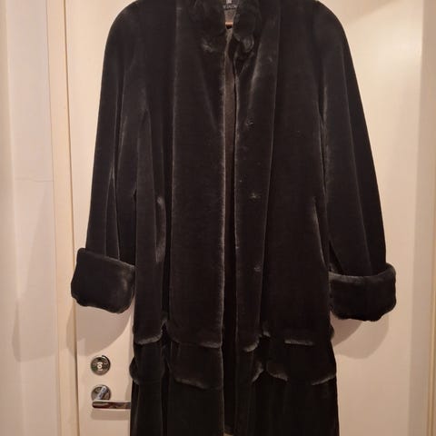 Myydään kuvan ruskea eläinkuosinen tekoturkki, jossa muhkeat hihat, edessä hakaskiinnitys ja taskut. A-linjainen, levenee alaspäin.