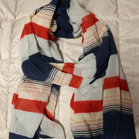 Uusi käyttämätön. Harmaa valkea 100% aitoa kierrätettyä villaa. Ainut että materiaalilappu on leikattu pois. Siitä kuva.Koko 180x36.voin postittaa kuten kaikki muutkin täällä myymäni tuotteet postit lisätään hintaan.
