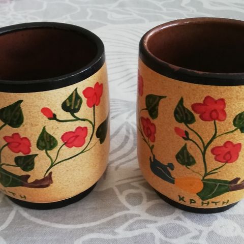 Keittokupit lautasella, kupin korkeus 6,5 cm ja halkaisija 12 cm, lautasen halkaisija 17 cm