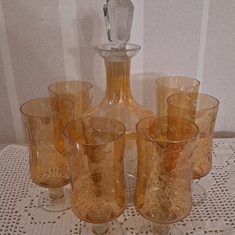 Harvinaisuus tarjolla - hieno vanha dekantteri. Tätä väriä vaikeampi löytää. On varmaan aika vanha, en ole vielä selvittänyt alkuperää, lisään tiedot myöhemmin. Viljan tähkän kuvat. En tiedä onko sisäpuolella jäämiä sisällöstä, en ole koittanut puhdistaa. Pohjassa jokin jälki. Postitus ok.
