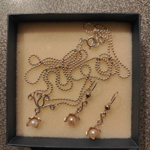 Käytetty, mutta hyväkuntoinen setti. Korvakorut ja kaulakoru myydään yhdessä.
