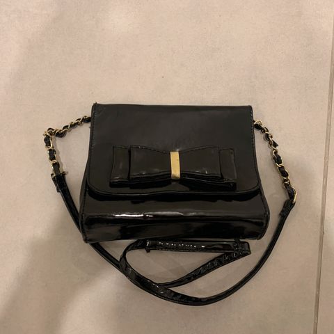Musta kiiltävää keinomateriaalia oleva juhlava pikkulaukku. Siistissä käytetyssä kunnossa. Sisällä pieni vetoketjutasku. Olkahihnaa itse lyhennetty, saa pidemmäksi halutessaan.