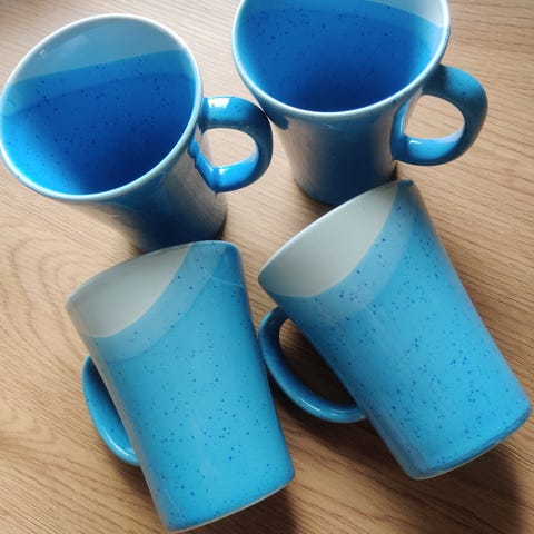 6 kpl vaaleansinisiä kahvikuppeja sekä aluslautaset.