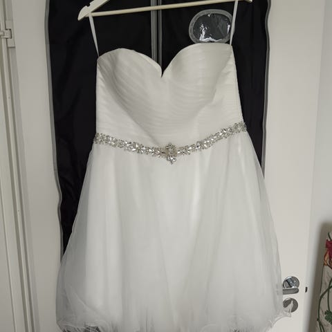 Myynnissä häämekko ja alushame jolla saa halutessaan kohotettua helmaa. Pitkä kirjailtu laahus. Nyöritys takana. sopii naiselle koossa 38/40. Mekon koko pituus 155cm, vyötäröstä helmaan 116cm. Sopii henkilölle pituudeltaan 170cm ilman korkokenkiä. Itse 168cm ja korkokenkien kanssa oli hyvä.