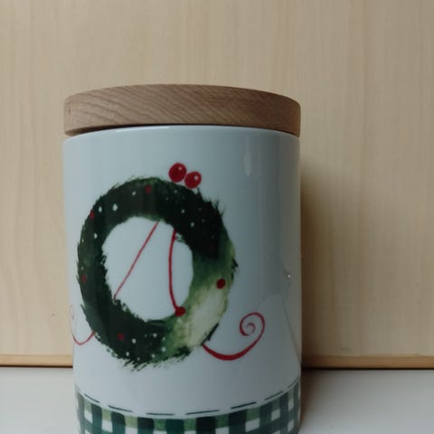 Kannellinen Arabian Kranssi-purkki, jonka on suunnitellut Minna Immonen. Korkeus 13,5cm, halkaisija 10,0cm. Keraaminen purkki ja puinen kansi tiivisteellä.