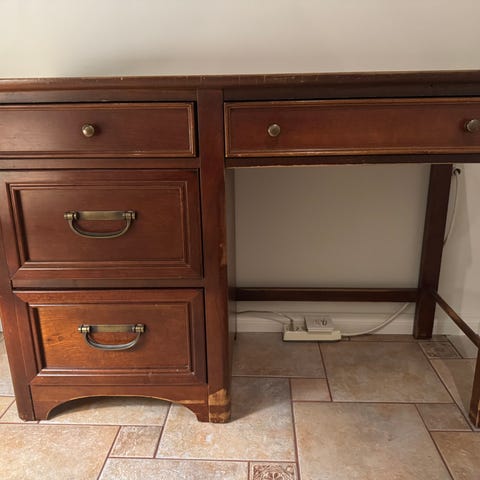 Pöydän pinnassa auringonvalosta tullutta sävyeroa ja tuolissa reikä verhoilussa(näkyy kuvassa).