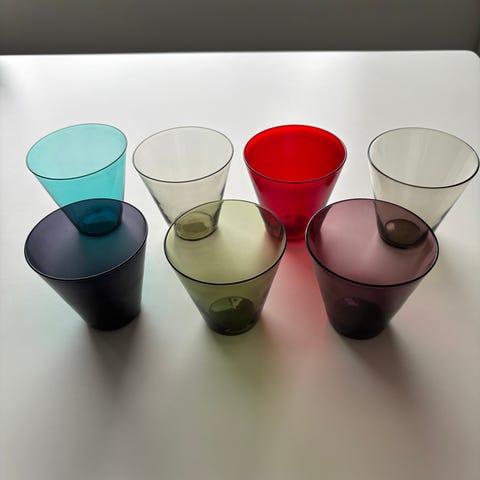 Kaj Franckin Kimara lasit (2744), rubiininpunaiset, 6kpl, 20cl, puhallettua lasia, valmistettu 1953-1967. Kaikki ovat ehjiä.