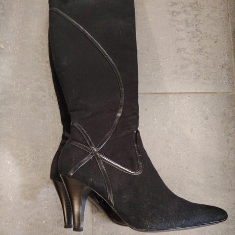 Keinonahkaiset, erittäin vähän pidetyt saapikkaat, ovat itselle väärän malliset jalkapöydän päältä.