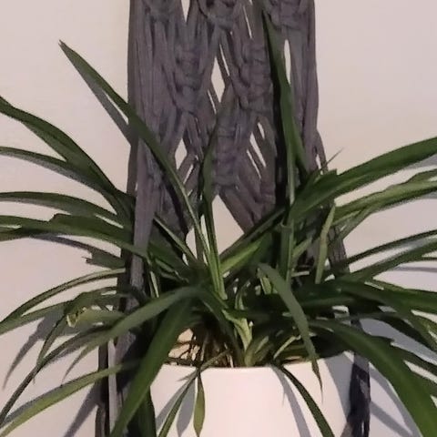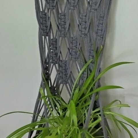 Musta makramee- seinäamppeli metallirenkaassa, pienelle ruukulle.