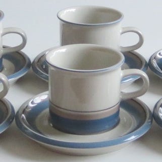 Skandinaavista viileyttä Inkeri Leivon taidokkaasti kuvaava Uhtua sarja tuli hankittua, kun se oli uutta vuonna 1982. Jäänyt paljolti vähäiselle käytölle kaappiin ja on siten erinomaisessa kunnossa edelleen, ei käytön jälkiä, huomaa kuppien ja tassien pohjarinkulat, jotka hohtavan valkoiset, ei tummentumaa. Kirkkaasti kiiltävä paksu lasite sallii astiapesukoneen käytön. Kuppi korkeus 6,5 cm ja halkaisija 7,0 cm. Tassi korkeus 2,0 cm ja halkaisija 12,5 cm.